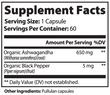 Ingredients: Organic Ashwagandha (Withania somnifera)(root), Organic Black Pepper (Piper nigrum)(fruit), pullulan capsules.