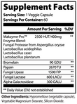 Ingredients: Makzyme-Pro™, Enzyme Blend (Fungal Protease from Aspergillus oryzae, Lactobacillus acidophilus, Lactobacillus cases, Lactobacillus plantarum), Bromelain, Papain, Fungal Lipase, Fungal Lactase, Alpha Galactosidase, Hypromellose (vegetable capsule), vegetable Magnesium Stearate, Silicon Dioxide.