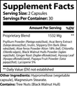 Ingredients: Proprietary Blend (Psyllium Powder, Acai Berry Extract, Inulin, Slippery Elm Bark, Aloe Ferox Powder Alion 18%, Chlorella, Black Walnut Hulls Powder, Ginger Root, Hyssop Leaf, Papaya Fruit Powder, Lycopene 5%, Hypromellose (vegetable capsule), Magnesium Stearate.